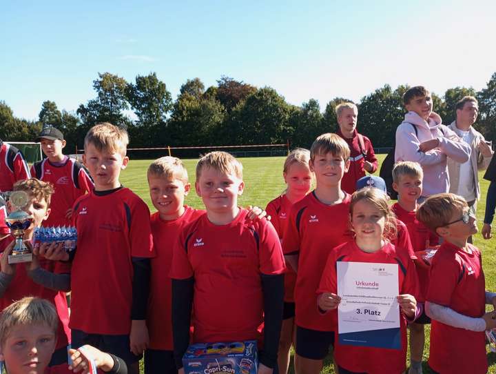 Am Dienstag, dem 07. Februar, reisten 11 motivierte Schülerinnen und Schüler unserer Grundschule zum Holcim Cup nach Brokdorf. Der Holcim Cup ist ein Handballturnier, welches als inoffizielle Handball-Kreismeisterschaft der Steinburger Grundschulen gilt. Es nahmen insgesamt 9 Mannschaften an dem Turnier teil. Die Kinder schlossen die Gruppenphase ohne Niederlage ab und zogen somit als Gruppensieger in das Halbfinale ein. Im Halbfinale trafen sie dann auf die Grundschule Kremperheide. Dass das kein leichter Gegner war, zeigte sich in dem ausgeglichenen Ergebnis nach der regulären Spielzeit von 10 Minuten. Leider reichte es in der Nachspielzeit nicht ganz für den Einzug in das Finale, und die Kinder spielten um den dritten Platz gegen die Grundschule aus Herzhorn. Am Ende des anstrengenden Turniertags nahmen sie noch einmal all ihre Kräfte zusammen und zeigten den zahlreichen Zuschauerinnen und Zuschauern ein großartiges letztes Spiel. Schließlich belegten sie den dritten Platz und können mit ihrer Leistung sehr zufrieden sein. Sie haben ihr Bestes gegeben und bis zur letzten Spielminute gekämpft. Das umfangreiche Rahmenprogramm sorgte dafür, dass in der spielfreien Zeit bei den Kindern keine Langeweile aufkam.