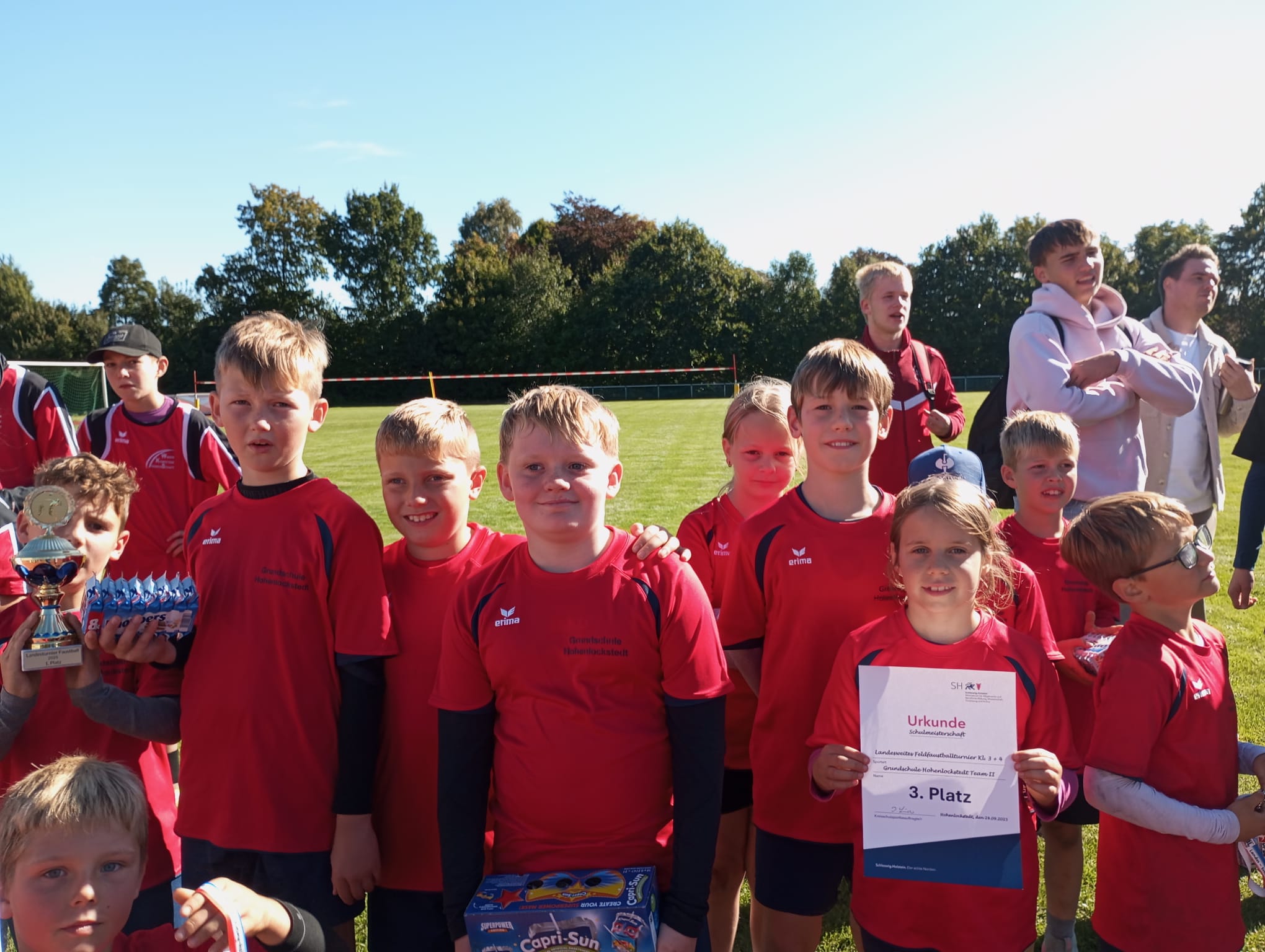 Drei Teams unserer Schule starteten bei der Faustball-Landesmeisterschaft in Großenaspe. Es wurde auf Zeit gespielt, nicht - wie sonst üblich - um Punkte. Alle Kinder hatten richtig viel Spaß! Ein besonderer Dank geht an Marcus Himmelhan, der alles organisiert hat, sowie an die Schiedsrichter und Betreuer Hannes, Lukas, Philipp und Theo. Die Teams erreichten einen 5., 7. und 9. Platz (von 14 Mannschaften). Herzlichen Glückwunsch!