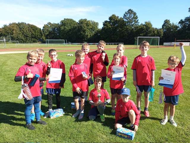 Zwölf Dritt- und Viertklässler/innen gingen für uns auf dem heimischen Sportplatz bei strahlendem Sonnenschein an den Start. Nach einer Pendelstaffel zu Beginn kamen unsere Sportler/innen bereits beim Medizinballschocken richtig in Fahrt. Es folgte eine überragende Leistung beim Weitsprung und Ballweitwurf und abschließend ein Ausdauerlauf. Banges Zittern bei der Siegerehrung ging in großen Jubel über, als klar war, dass unsere Mannschaft den Vizekreismeistertitel (von 12 Mannschaften) gewonnen hatte. Herzlichen Glückwunsch!